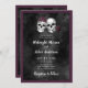 Invitación de boda oscura y hermosa con una pareja de cráneos de esqueletos con rosas y un fondo negro sombrío sobre fondo púrpura. La parte trasera de la invitación tiene cráneos más pequeños. Perfecto para una boda gótica o de Halloween.