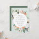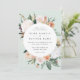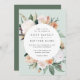 Elegante invitación a la boda floral con detalles bodas en letras modernas, enmarcada en un marco redondo de flores de color pastel y follaje botánico en tonos tierra inspirados en el desierto, de melocotón, verde salvia, blanco y marfil.