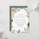 Elegante invitación a la boda floral con detalles bodas en letras modernas, enmarcadas por flores de color pastel y follaje botánico en tonos tierra inspirados en el desierto, melocotón, verde salado, blanco y marfil.