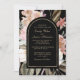 Elegante invitación de bodas al estilo boho con rosas color agua rosa y bonito y una variedad de otras flores y vegetación sobre un fondo negro.