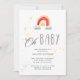 Invitación a la ducha de bebé Boho con arco iris con ilustraciones de nubes en rojo y naranja emparejados con un tipo de letra de guión personalizado. Visita nuestra tienda para ver más artículos coincidentes de esta colección.