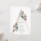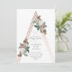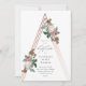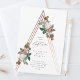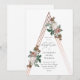 Una invitación de bautizo femenina con hermosos botánicos vintage sobre una forma de triángulo estructural de oro rosa.