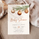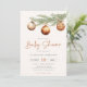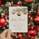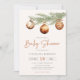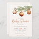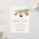 Minimalista invitación de ducha de bebé neutra de género con una rama de pino acuarela decorada con adornos navideños.
