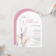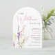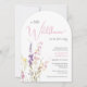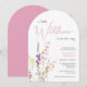 An elegant and whimsical arch-shaped baby girl shower invitation featuring "a little wildflower is on her way" in a blend of soft grey typography and a stylish pink script, and a boho-inspired watercolor bouquet of dainty purple, pink and yellow wildflowers.