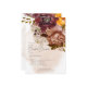 Este diseño cuenta con un gran ramo de marsala en esquina, dorado amarillo, arcilla y flores blancas sobre un fondo salpicado de color marrón. Los tonos de joyas son perfectos para los bodas de otoño o finales del verano. Creado por Simply Farmhouse Press.