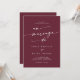 Esta moda de bodas burdeos rojo QR código francés invitación a la boda es perfecta para un boda minimalista. El moderno diseño bohemio-rojo, de color marrón oscuro, presenta una caligrafía rústica sencilla con un estilo único y clásico. Incluya un código QR en la parte posterior de la invitación para que el invitado pueda ver fácilmente RSVP, ver detalles o ambos.