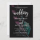 La romántica invitación a la boda con fotos de moda de boho presenta una colorida pluma y un fondo negro.