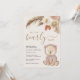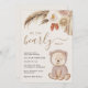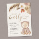 Invitación a la ducha de bebé Boho con un ilustracion acuarela de un oso de peluche lindo, un ramo de pasto y flores beige y terracota y "We Can Bearly Wait" en una mezcla de tipografía simple y un guión de swash elegante.