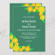 Esta elegante invitación a la boda de girasol es perfecta para un boda floral moderno. El diseño es sencillo y está decorado con girasoles naranjas y amarillos floridos, con una elegante tipografía blanca sobre un fondo verde.