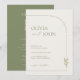 This invitation beautifully blends minimalist elegance with a warm bohemian vibe. The back features an arch-shaped Details slot with QR for you to add you own QR Code, reception, accommodation and RSVP details., set against a calming sage green background with delicate white line-art arches.