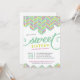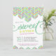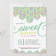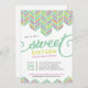 Esta alegre y colorida invitación dulce de dieciséis años presenta caligrafía de escritura de bonito, un diseño geométrico exclusivo de plumas y un adorable tema de boho. La paleta de colores es rosa neón, verde, amarillo y gris.