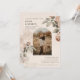 This wedding invitation features a soft, romantic vintage botanical style with subtle boho and rustic influences. The design showcases delicate, engraved-style florals in muted terracotta, sage, and warm taupe tones set against a faux textured parchment background, giving it an heirloom, old-world feel. An arched photo frame in the center adds a modern yet timeless architectural element, blending classic elegance with relaxed countryside charm. The earthy color palette, natural foliage details, and organic layout lean toward boho-rustic, while the refined typography and structured composition keep it polished and sophisticated rather than overly casual.