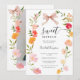 Hand-painted wildflowers in blush, peach, coral, and soft yellow frame this feminine Sweet Sixteen design, finished with a delicate pink coquette bow at the top. The layout blends romantic script lettering with clean modern type, creating a fresh, airy look that feels both playful and elegant.