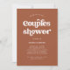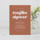 Esta sencilla y boho invitación a la ducha de parejas bodas presenta una tipografía blanca y retro sobre un fondo neutro de terracota.