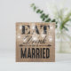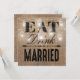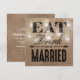 Estas caprichosas invitaciones para la cena de ensayo de boda campestre vienen como un conjunto de boda a juego con un efecto de arpillera marrón rústico en el fondo, elegantes luces centelleantes de hilo en un tarro de mason, las palabras "COME, BEBE Y CÁSASE" y los detalles de la cena de ensayo en el reverso.
