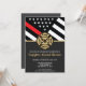 Esta invitación a la fiesta de graduación incluye una bandera de bomberos con franjas blancas y negras, y una delgada franja roja también. Una insignia de bombero se sienta sobre todo los detalles del fiesta para el bombero que se gradúa.