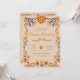 Invitación de la quinceanera floral mexicana con flores de arte folclórico de fiesta en la paleta de color tierra del champán naranja rosa beige azul y amarillo. Diseño distintivo con escritura manuscrita elegante para el nombre de la joven. La plantilla está configurada para añadir su monograma en la parte posterior y los detalles de la invitación de 15 años en la parte delantera. Por favor, navegue por mi colección Floral Mexicana para ver los artículos que coincidan.