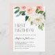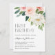 Invite a los invitados a su evento con esta invitación de fiesta de personalizable de primer cumpleaños. Cuenta con un ramo de flores y flores de color acuático con flores rosas y blancas y vegetación. Personalice esta invitación floral de fiesta de primer cumpleaños agregando los detalles del evento. Esta invitación floral acuática es perfecta para eventos de primavera.