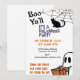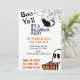 La invitación a la fiesta de Halloween de un niño simple y simpático con la popular frase "Boo Y'all", también incluye a un fantasma amistoso, un gato negro y el verso "truco o trato que tenemos de comida para comer".