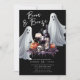 Esta invitación espeluznante y divertida incluye un fantasma, calabazas, un cóctel espeluznante y un cráneo. Las palabras "Boos y Booze" están escritas en un tipo de letra de guión. Es la manera perfecta de invitar a tus amigos a una fiesta de Halloween donde pueden venir vestidos con sus disfraces y disfrutar de cócteles.