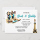 Un par de relucientes botas de vaquero marrón y azul turquesa parecen brillar y brillar sobre un fondo blanco que tiene una botella de burbujas en la esquina inferior derecha y plantillas editables negras a la izquierda. Este elegante y generativo diseño de contenido de moda es ideal para una ducha de novias con temática de campo occidental "con botas y burbujas".
