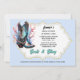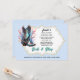 Una única funda de capucha marrón y azul brillante tiene tendrillos de plumas suaves alrededor de ella y una cubierta de vieira de borde blanco y falso dorado detrás de ella en la que aparecen plantillas editables en negro sobre un fondo blanco. La entrada está enmarcada por un fondo azul pálido que puede cambiarse a cualquier color de su elección. Este elegante y generativo diseño de contenido de moda es ideal para una ducha de novia con tema de campo occidental con "botas y bling".