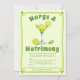 Invitación de Despedida de Soltera con cóctel Margs & Matrimony y rayas garabateadas. Esta invitación moderna presenta una encantadora ilustración de un vaso de cóctel margarita adornado con rodajas de lima, que captura perfectamente el espíritu de una divertida despedida de soltera. El fondo presenta un patrón de rayas verdes y blancas vibrantes que agrega un toque refrescante, evocando sentimientos de calidez y alegría. Alrededor de la invitación hay un caprichoso borde verde lima garabateado, adornado con corazones juguetones, que agrega un toque romántico al diseño general. Esta invitación no es solo un trozo de papelería; es una invitación a una celebración sincera de amor y amistad, que marca el tono para un evento inolvidable.