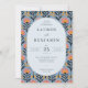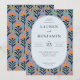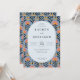 Esta invitación de boda presenta un diseño vibrante y juguetón con un marco ovalado en el centro, rodeado de un patrón floral simétrico. La paleta de colores incluye tonos alegres de rosa coral, naranja y azul marino intenso sobre un fondo azul claro, creando una atmósfera alegre e invitadora. La técnica artística es ilustración digital, caracterizada por líneas limpias y colores planos, lo que le da un aspecto moderno y retro. La tipografía serif elegante destaca el texto principal, asegurando claridad y formalidad, mientras que los motivos de flores estilizadas añaden profundidad e interés visual. Perfecta para celebrar una ocasión festiva, este diseño logra un equilibrio entre elegancia y capricho.