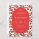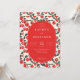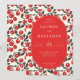 Esta invitación de boda presenta un diseño vibrante y festivo con un centro ovalado rodeado por un patrón repetitivo de cerezas rojas y hojas verdes sobre un fondo crema. La paleta de colores incluye rojo brillante y verde bosque profundo, creando una atmósfera alegre e invitadora. La tipografía combina fuentes serif elegantes con escritura juguetona para la palabra "y", realzando el tema romántico. El diseño es equilibrado y claro, lo que lo hace perfecto para celebrar una ocasión alegre con amigos y familiares.