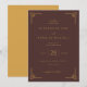 Esta elegante invitación de boda presenta un fondo granate profundo con bordes geométricos dorados, creando una estética sofisticada y formal. El diseño incluye una mezcla de fuentes serif, sans-serif y script en dorado, lo que mejora la legibilidad y el atractivo visual mientras mantiene un aire de celebración. Los campos de texto personalizables permiten la personalización, lo que la hace perfecta para parejas que buscan agregar su toque único en su día especial. El ambiente general es de elegancia y refinamiento, ideal para una ceremonia de boda memorable.