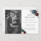 Resalta tu foto previa a la boda con esta tarjeta de foto de "save the date" boho chic. Cuenta con una hermosa corona de flores y follaje de vegetación en acuarela en color burdeos, azul marino y rosa. Personalízala con tus detalles de manera fácil y rápida, simplemente presiona el botón de personalizar para reorganizar y dar formato al estilo y ubicación del texto.