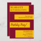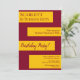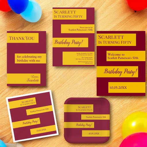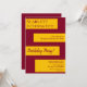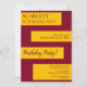 Esta elegante invitación al Borgoña y al oro cumpleaños es perfecta para un cumpleaños moderno. el diseño es sencillo y elegante, con una caligrafía burdeos sobre rayas doradas en un fondo burdeos.