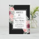 Esta elegante invitación a los cumpleaños de la flora incluye una flor de rosa de color burdeos con hojas y disposiciones de vegetación sobre un telón de fondo negro.