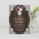 Elegante y rústica invitación a la boda borgoñona y floral con un ramo de rosas y flores de aliento de bebé dentro de un frasco de albañil contra un fondo de madera de granero adornado con encajes florales blancos y luces de cuerdas. Diseño de tarjetas perfecto para invitar a sus invitados a su fiesta de bodas rústica y ruidosa. Personalice fácilmente esta invitación de boda con los detalles de su boda en línea. Diseño de personalizable completo. Elementos coincidentes disponibles.