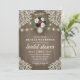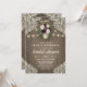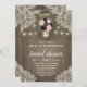 Invitaciones a la ducha de la novia del Rubor rosado Gold Mason Jar Jar - con un fondo rústico de madera de pino con encaje de marfil, luces de cuerda y un antiguo frasco de albañil de oro lleno de vegetación, eucalipto y rosas y peonías en tonos burdeos y rosa rubí. Cambie las iniciales de la demo en el frasco por las propias. Vea la colección coincidente en esta página para ver los productos de coordinación.