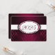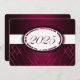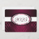 Invitación a la fiesta de graduación en blanco y borgoña con franjas burdeos claras y oscuras y una cinta blanca cruzando para mostrar el año de graduación. La parte trasera de la tarjeta es borgoña con letra blanca para que la gente llene las invitaciones a la fiesta de graduación.