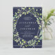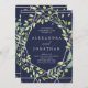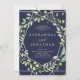 Esta elegante invitación a la boda presenta un marco geométrico moderno y plateado, con una corona de flores rellena de hojas verdes a la moda sobre un fondo azul de medianoche.