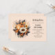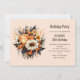 Una invitación al cumpleaños con un elegante pero gótico ramo de flores. Compuesto por tulipanes naranjas, margaritas amarillas, hojas y brotes grises y algunos acentos de berry naranja.