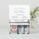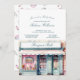 Una encantadora invitación francesa inspirada en una boutique para una ducha de bebé, con un diseño de una tienda acuarela y elegantes fuentes de escritura. Este tema Bonjour Bébé, acentuado por los rosebudos pastel y los macarones en la parte trasera, aporta un toque romántico y parisino a la celebración. Ideal para una moda y una ducha femenina con un toque francés dulce.