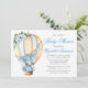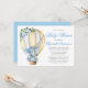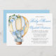 Elegante y moderno color de agua azul Floral azul Floral Balón de aire caliente con una invitación Baby Shower Blue Bow. Incluye hermosos rosas azul acuático, flores blancas y vegetación botánica. Texto plateado y azul.