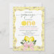 Bow Lemon Rosa Nuestro principal apretón Invitación al primer Cumpleaños Invitación Dulce Invitación con limón Tocado en el primer cumpleaños para una niña con flores blancas, dos limones, arco rosado, marco ondulado y un fondo amarillo floral. Esta invitación a cumplir 1° cumpleaños también incluye una palabra decorativa que deletrea una.