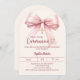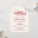An arch shaped invitation. A soft cream colored background, decorated with a pink large bow and a golden cross. Personalize and add a name and details details.