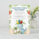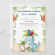 This 'two-a-saurus' design is suitable for a boy's 2nd birthday party. The design includes blue and dark grey font, watercolour jungle elements and a blue dinosaur with party balloons.