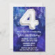 Muchacho blanco azul blanco 4º cumpleaños invitación a los chicos de 4 cumpleaños para una fiesta de cumpleaños para un muchacho morado azul con escritura moderna y divertidos globos de Relieve metalizado.
