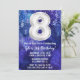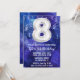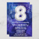 Muchacho blanco azul blanco 8º cumpleaños invitación chicos 8 cumpleaños fiesta de invitación para un niño morado azul con escritura moderna y divertidos globos de Relieve metalizado.
