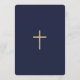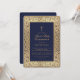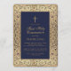 Esta elegante invitación floral a la primera comunión con un aire vintage tiene un marco dorado floral de intrincadas decoraciones de rosas salvajes en un fondo azul marino. Todo el texto puede ser personalizado y tiene un color dorado similar al de los rosas de oro en el marco. Por encima del texto hay una cruz de oro. Las palabras "Primera comunión sagrada" están escritas en un elegante guión caligráfico. En la parte trasera, hay una cruz de oro sobre fondo azul marino. El marco de los rosas de oro es de una portada de un libro vintage de 1912, de Las Obras Poéticas Completas de Geoffrey Chaucer, ahora de dominio público.