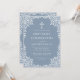This elegant dusty blue first communion invitation with a vintage air, recommended for a boy, has an ornate frame of intricate branches with leaves on a dusty blue background. Above the text there is a religious cross. The background is dusty blue, the leaves frame, the cross and the text are white. All text can be personalized.