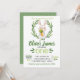 Esta es una invitación de primer cumpleaños de un conejito de niños verdes con un lindo conejito acuarela sosteniendo una zanahoria. Una hermosa corona floral verde rodea el conejito. ¡Perfecto para un fiesta en o alrededor de Pascua!