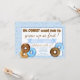 Invitaciones para fiestas de cumpleaños de Boy Donut con donuts de espuma marrón y azul sobre un fondo de rociado multicolor azul. Esta invitación para la fiesta de cumpleaños se personaliza fácilmente para tu evento simplemente añadiendo tus detalles.