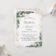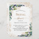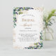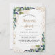 Bienvenidos a una elegante ducha de novias. Un fondo blanco moda. Decorada con hojas de eucalipto de color verde acuático, escarabajos, vegetación, hojas falsas de oro y polvo de purpurina dorado. Personalice y agregue el nombre de la novia para que sea y los detalles de la parodia. Letras negras y doradas.